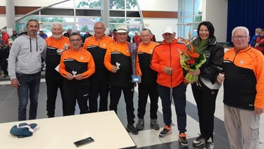 Triplettes Vétérans Issoire 13/03/2025 : Patrick, Pierre et Robert partagent en 1/2 du A . Dominique remporte le B avec son équipe.