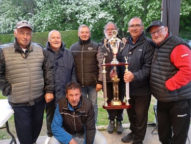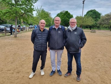 Triplettes vétérans P2000 17/04/2025 Beau temps 30 équipes au départ. Christian, Dominique et Jacko partagent en 1/2 du A.