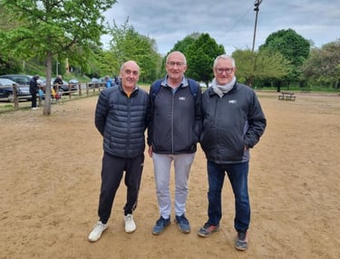 05/07/24 Triplettes départementales Moulins : Dominique avec 2 extérieurs partage en 1/2 du A et perd à la pièce. 86 équipes au départ. Manu et Jacko perdent en quart.