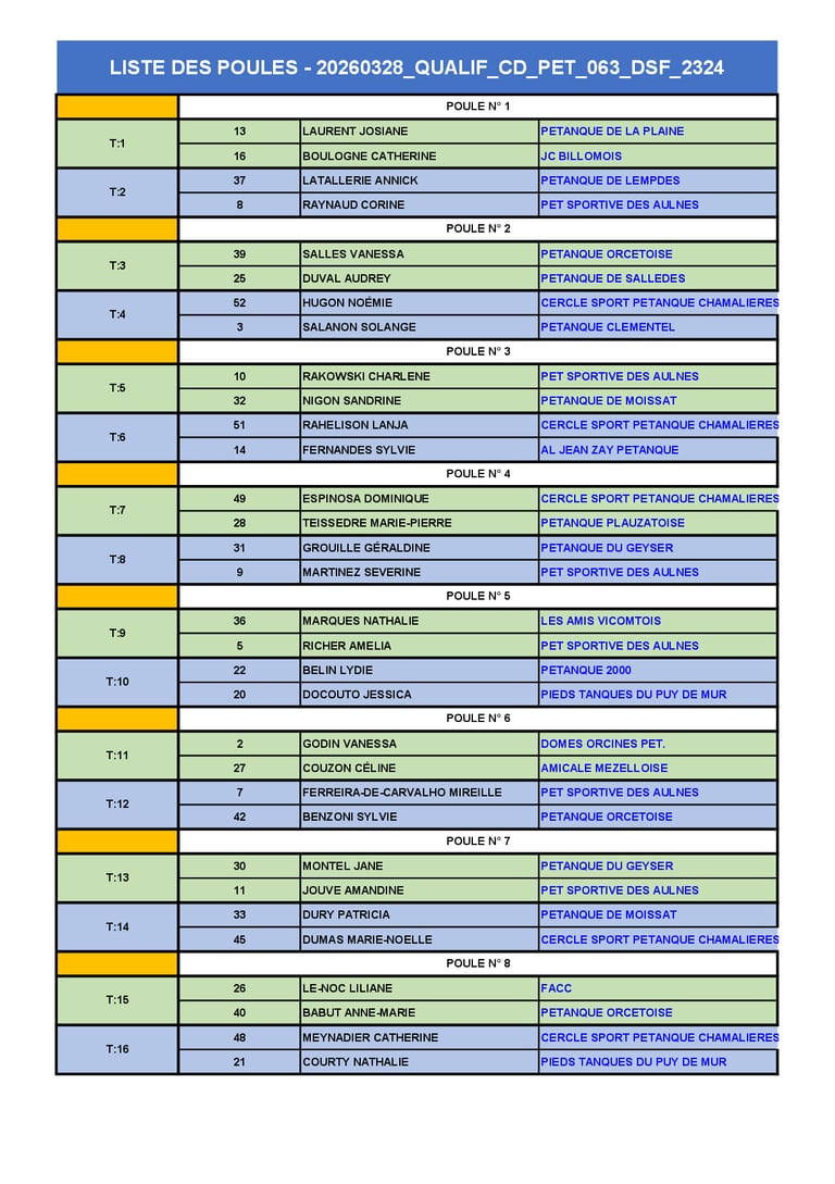 TIRAGE POULES CPDD DOUBLETTES FEMMES 28/03/2026 08H30 ASP63 (BUGHES)