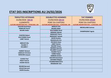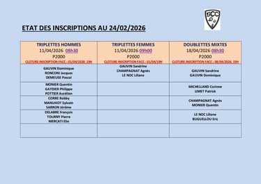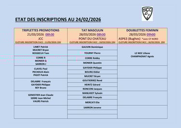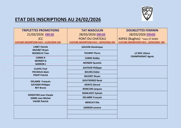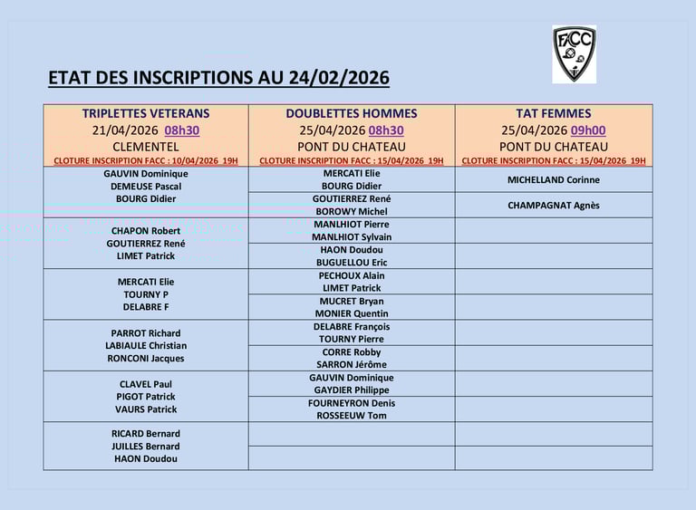 TAT masculins : 14 joueurs engagés par la FACC. Seul François se qualifie pour les éliminatoires du 23 à Aigueperse. Malheureusement celui-ci ne parvient pas à sortir de poule aux éliminatoires d'Aigueperse. Saluons toutefois son beau parcours.