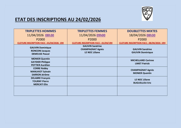 La FACC présentait 4 équipes : 1) Christian, Richard et Jean Luc, 2) Daniel, Patrick B. et Gilles, 3) Bruno, Philippe et François, 4) Christophe, Sylvain et Julien. Sur les 4, 3 sortirent des poules mais malheureusement aucune ne parvint à passer la première partie après les poules non sans avoir livré de belles batailles puisque les différents scores furent très serrés. Donc aucune équipe FACC qualifiée pour la suite des évènements. Merci aux supporters venus très nombreux pour encourager nos équipes. Photothèque
