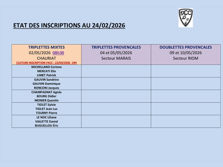 Christian L, Jacob et Tiolet qualifiés pour les éliminatoires de jeudi 17 avril à Riom. Dominique, Pascal et Bruno perdent à la partie de qualif. Venez nombreux encourager notre équipe. Merci pour eux.